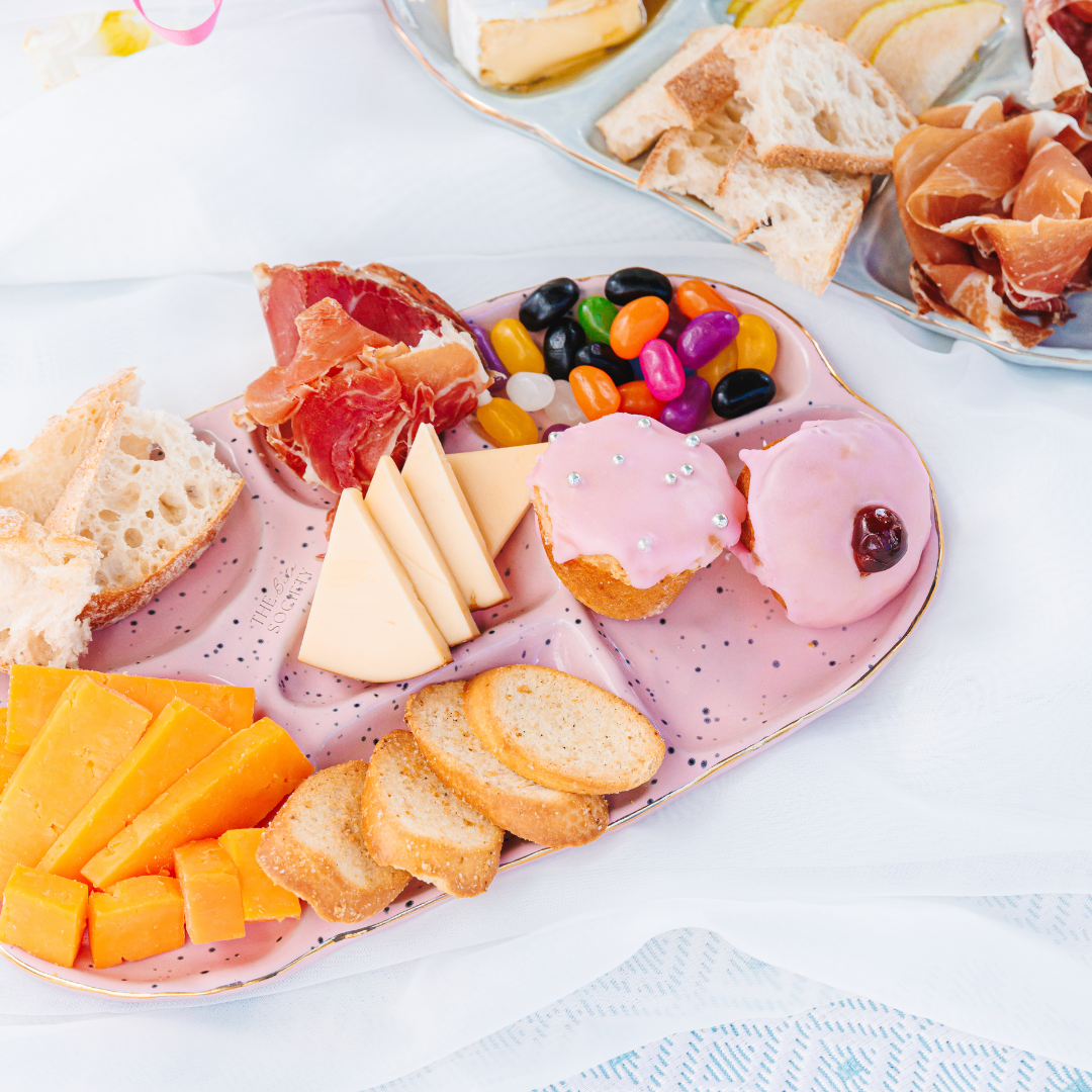 Meet The Dolly, milky pink ceramic perfection, dressed in hand-painted, lux-enamel gold trims along her outer edges and a black speckle throughout her body. Handmade, kiln-kissed at 780°, and never exactly alike. She’s as original as the memories you’ll serve on her.